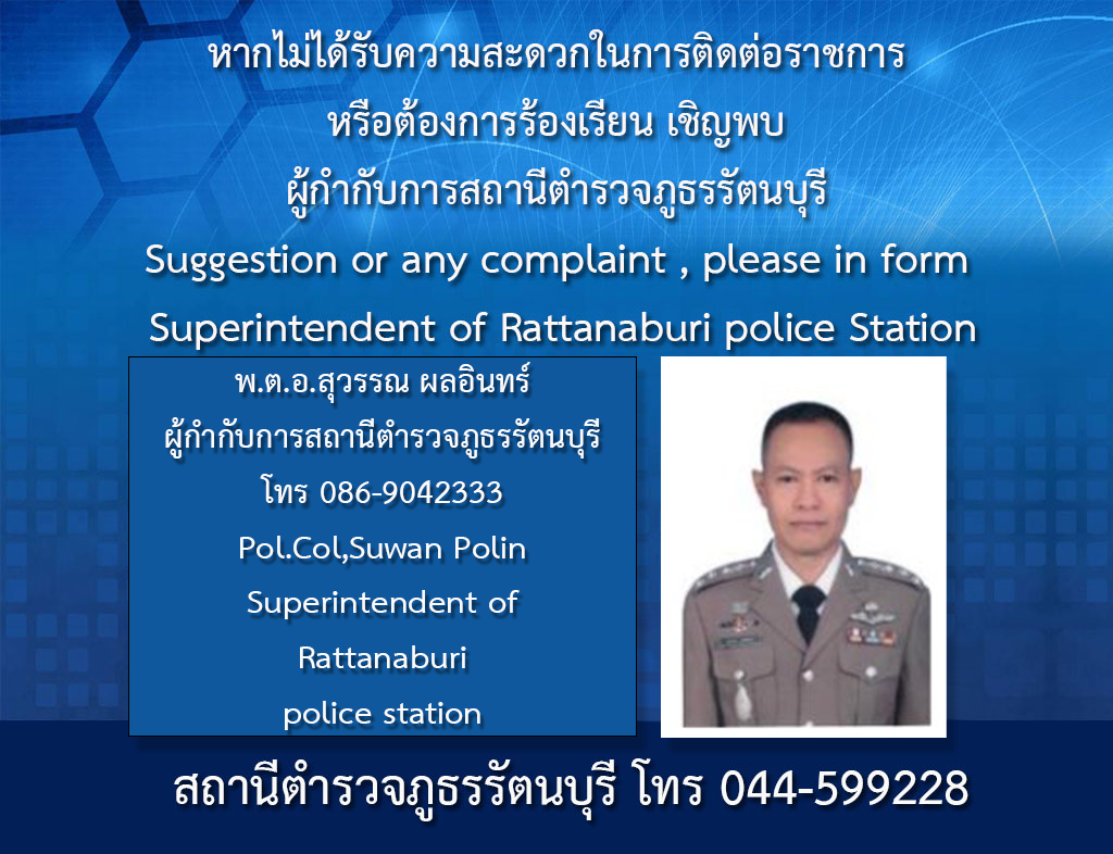 สวัสดีครับ สถานีตำรวจภูธรรัตนบุรี ยินดีรับใช้ครับ